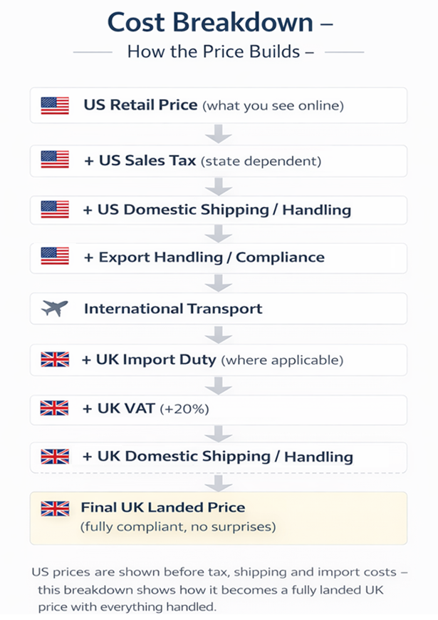 We source genuine US products, handle the export/import process, and provide a clear UK-delivered price before you commit.